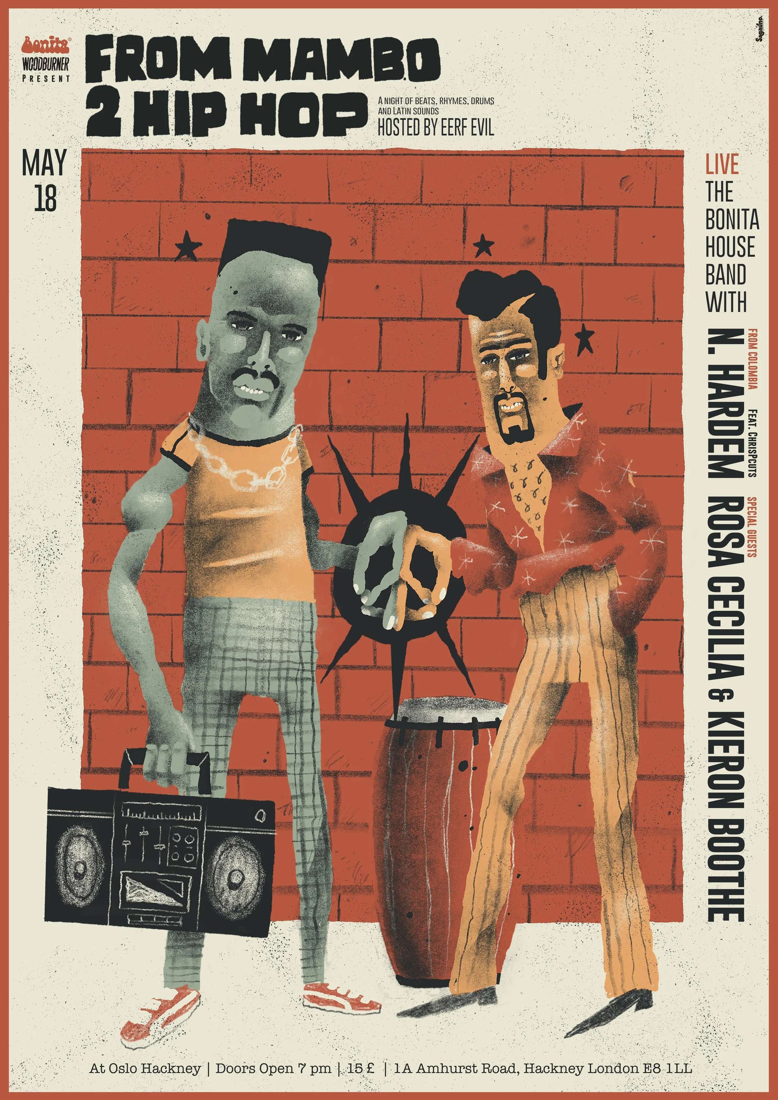 London-based 8-piece The Bonita Band play host to three irresistible vocalists: Colombian rap star N Hardem, rising latin singer Rosa Cecilia, plus East London lyricist Kieron Boothe (The Silhouettes Project), hosted by Eerf Evil.