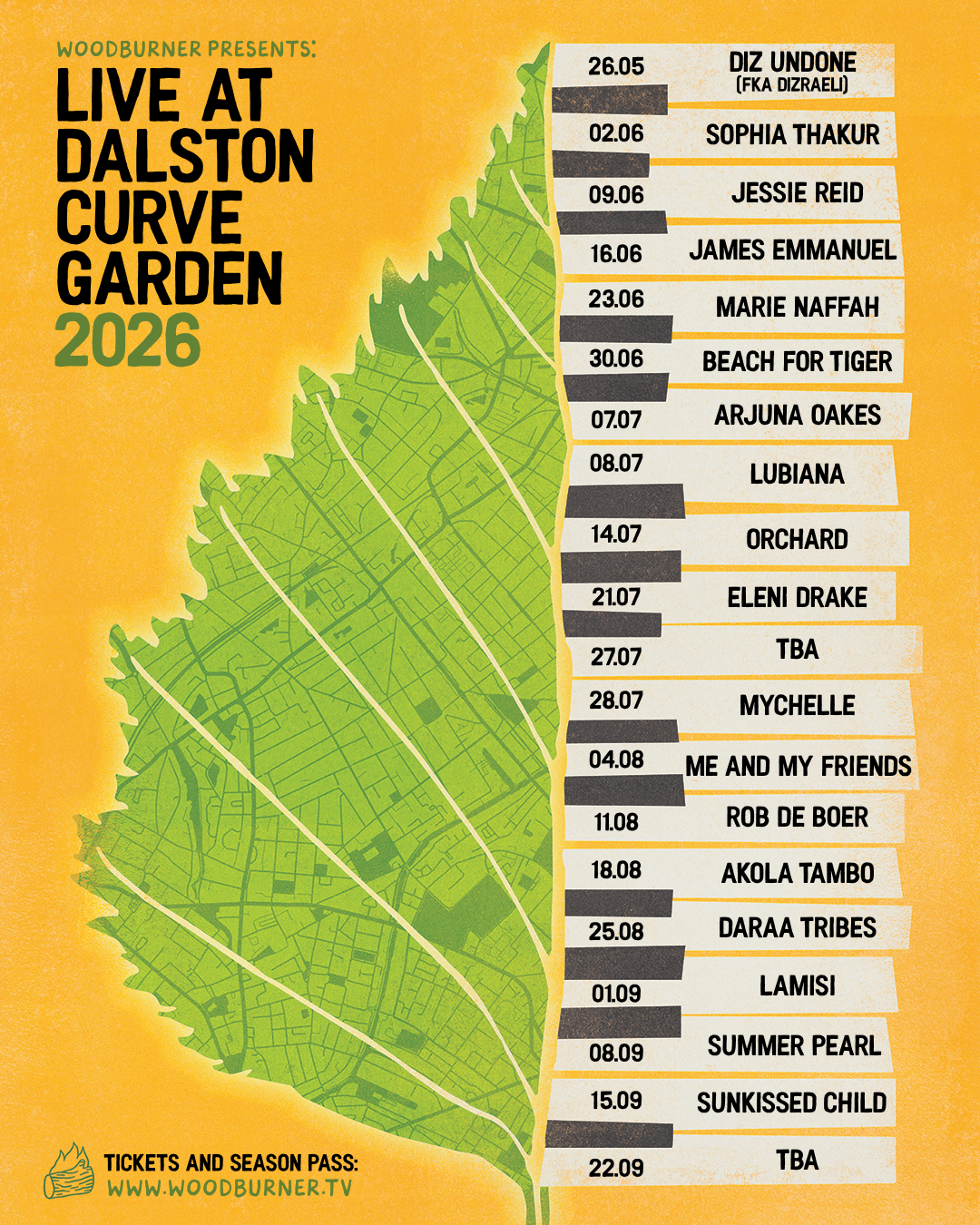 Attend all our events at Dalston Curve Garden in 2026, for one low price. See dates and headliners below - each event will also feature a support act.